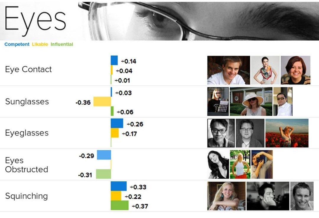 O uso de óculos de sol – bloqueio dos olhos – pode prejudicar significativamente a sua primeira impressão. O efeito altera um pouco dependendo do que está obstruindo os olhos.