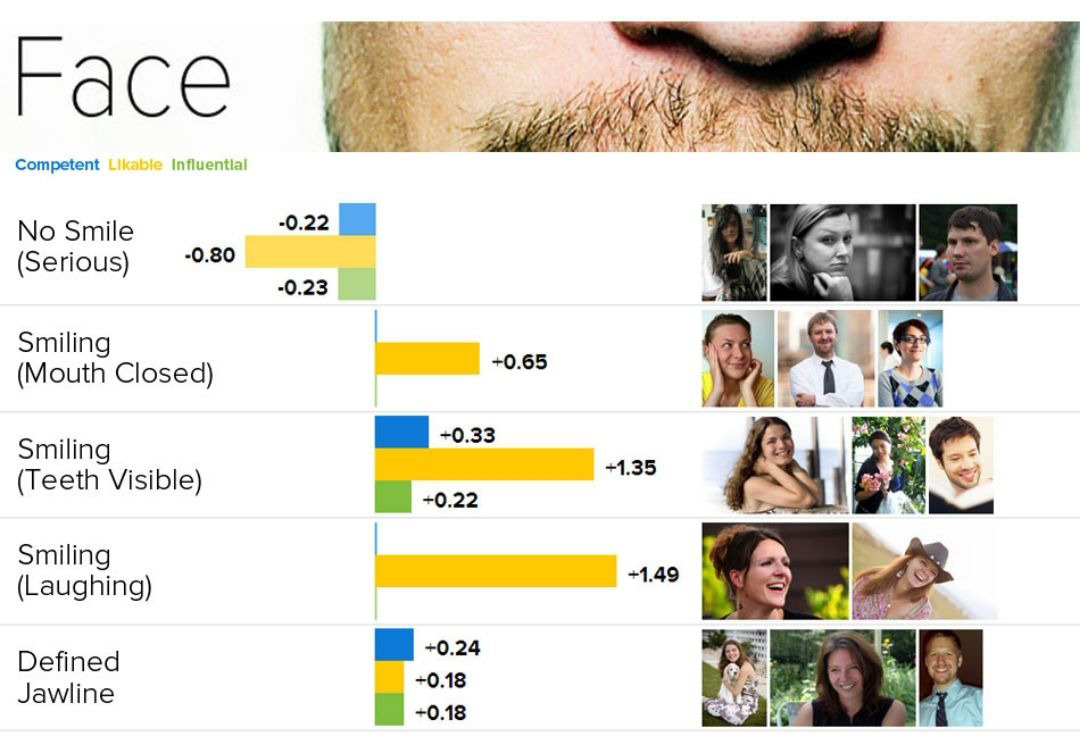 Um sorriso com dentes visíveis ganha pontos consideráveis contra um sorriso de boca fechada, porém, cuidado, existe uma linha tênue aqui, se a foto passar do sorriso para o risonho, você ainda ganha pontos na Probabilidade, mas perde na Competência e Influência percebida.